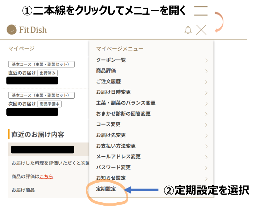 画面右上の二重線部をクリックして、マイページメニューを表示させ、メニュー最下部の「定期設定」を選択