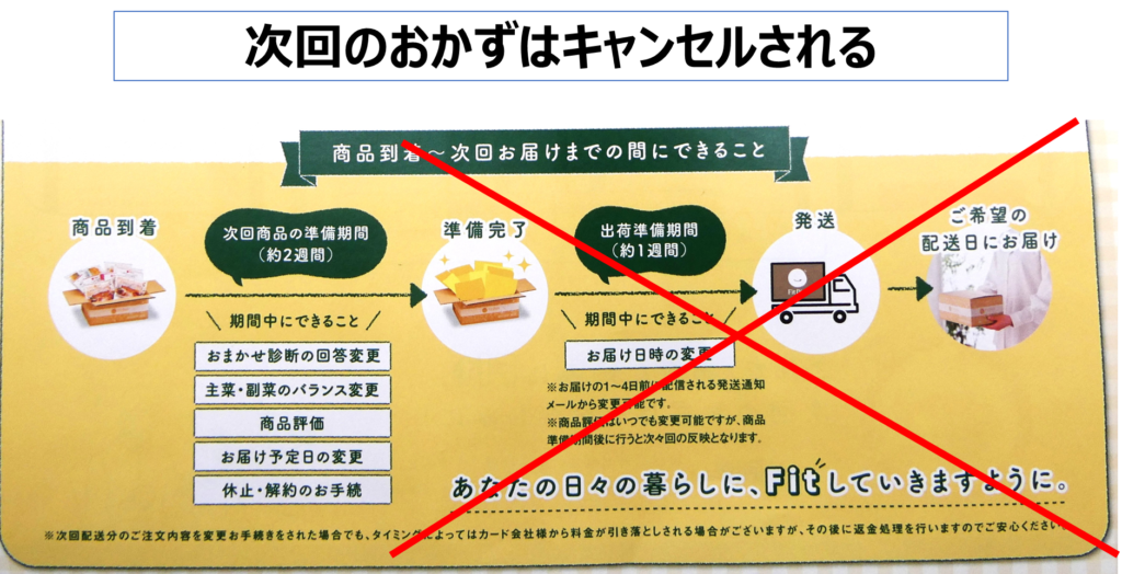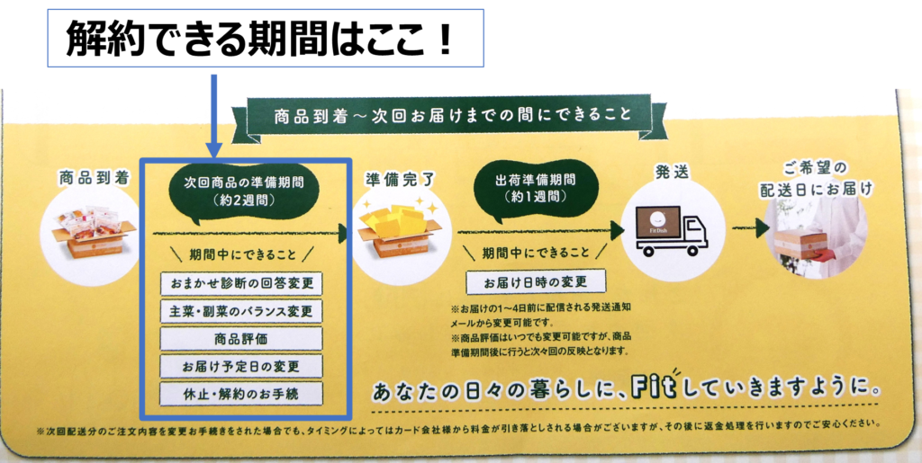 FitDishからおかず定期便が届いた翌日から約2週間かけて次回のおかず定期便を準備するようになっていて、この約2週間の商品準備期間に解約できます。