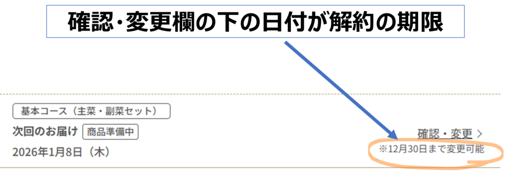 FitDishにログインしてマイページを表示させると、画面に「次回のお届け」欄があるので、その右方向の「確認・変更>」の下部に「○○月××日まで変更可能」と表示されている場合には、その「○○月××日まで」が解約期限です。