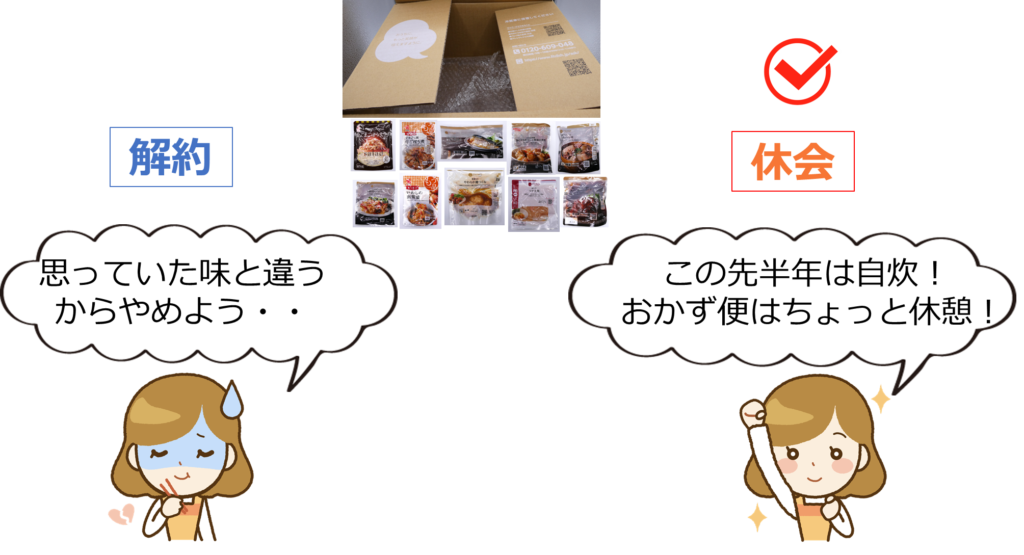 休会は「一時的な休止」。少しの間だけおかず定期便サービスを停止できる仕組みです。