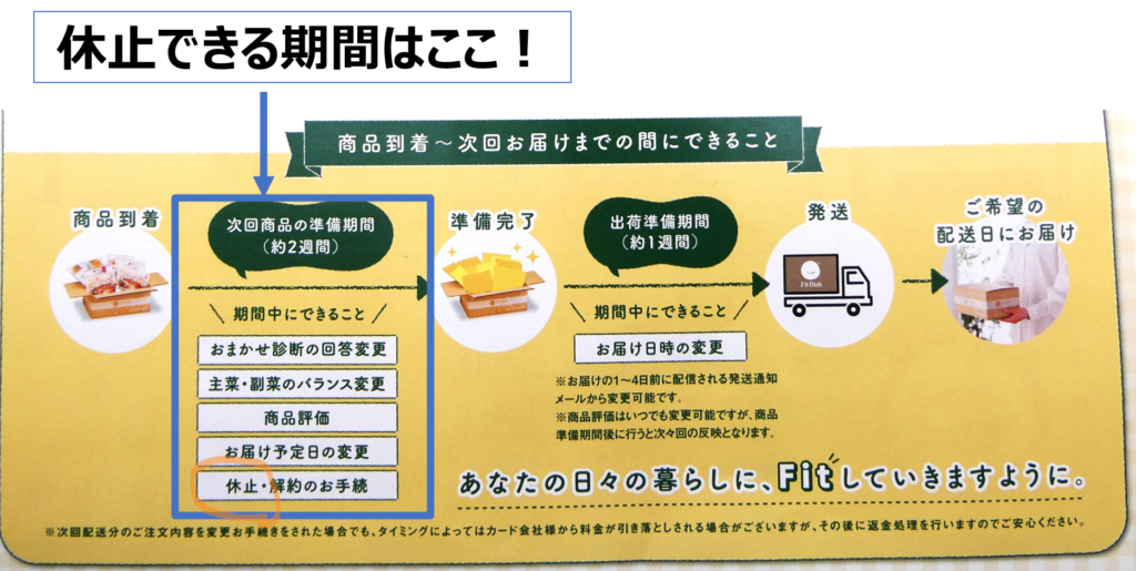 FitDishからおかず定期便が届いた翌日から約2週間かけて次回のおかず定期便を準備するようになっていて、この約2週間の商品準備期間に休会できます。