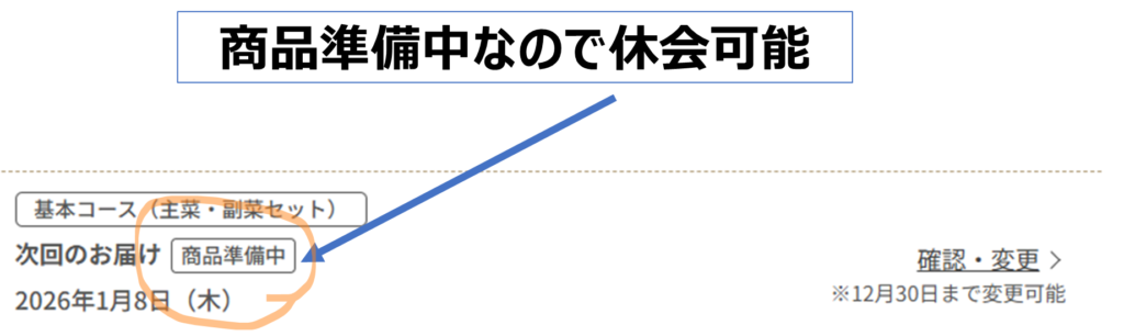 下の図のように、次回のお届けの横に「商品準備中」と表示されていれば、ただちに休会手続き可能です。
