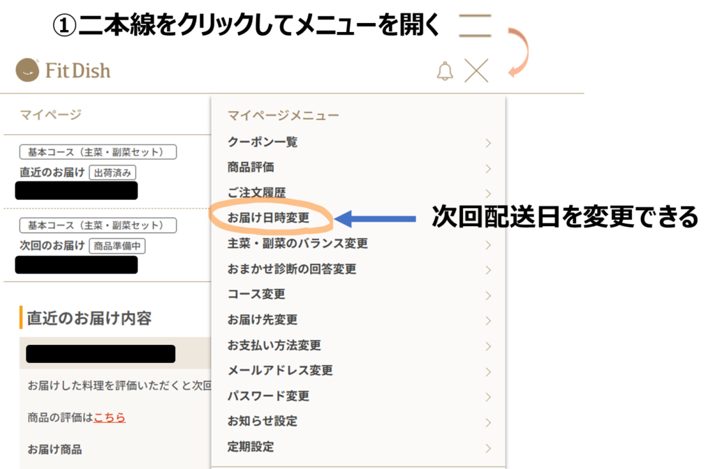 FitDishでは、次回のおかず定期便が届く日をマイページメニュー「お届け日時変更」を選択して変更できます。