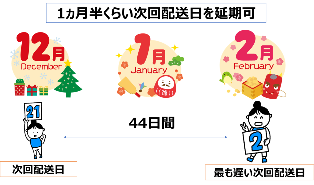 次回のおかず定期便が届く日を1ヵ月半くらい延長できる仕組みになっています。