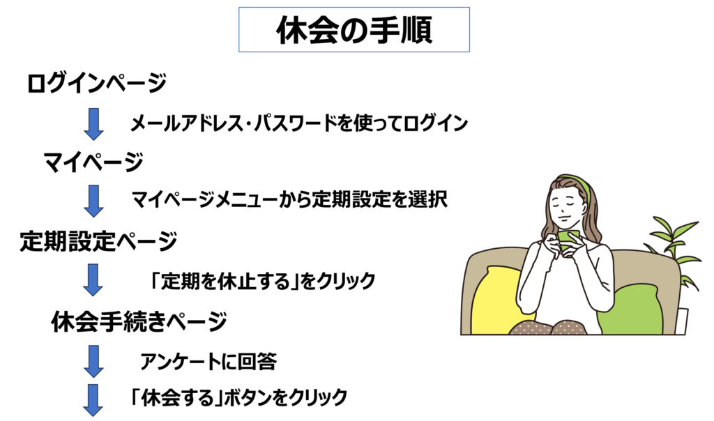 1ヵ月くらい休会(一時的に休止)するのであれば、次回のおかず定期便が届く日を1ヵ月延長するほうが簡単だと思います。
