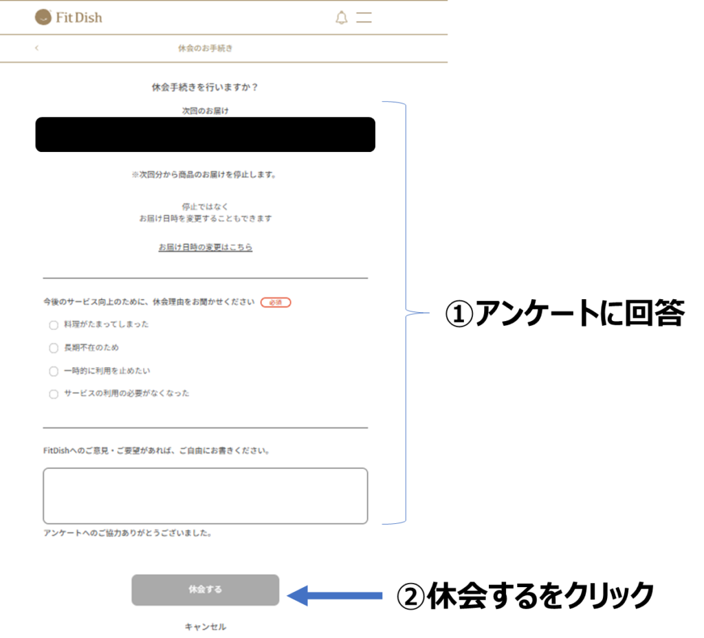 FitDishを休会(一時的に休止)する方法を紹介します。5分程度で休会手続き終了です。