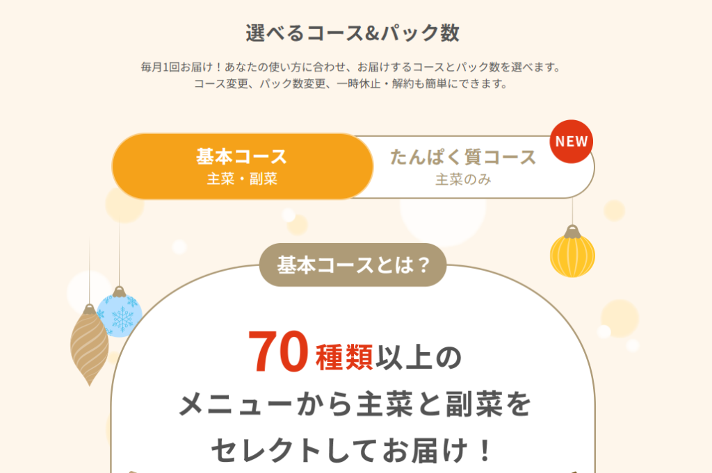 私は、自分で用意するつもりのお味噌汁・お茶・サラダ以外は全て届けて欲しかったので、基本コースを選びました。