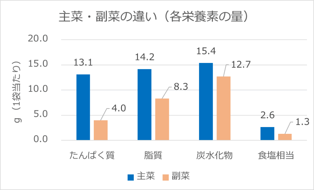 主菜の惣菜は副菜の惣菜と比較して、魚・肉類をメイン食材としているので、たんぱく質と脂質が比較的多い結果となっています。
