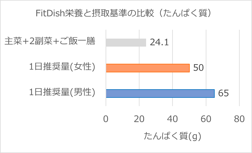 たんぱく質においては、FitDishの主菜と2種類の副菜にご飯一膳を組み合わせた食事を1日に2回程度とると、男女共に1日摂取推奨量にだいたい到達しています。