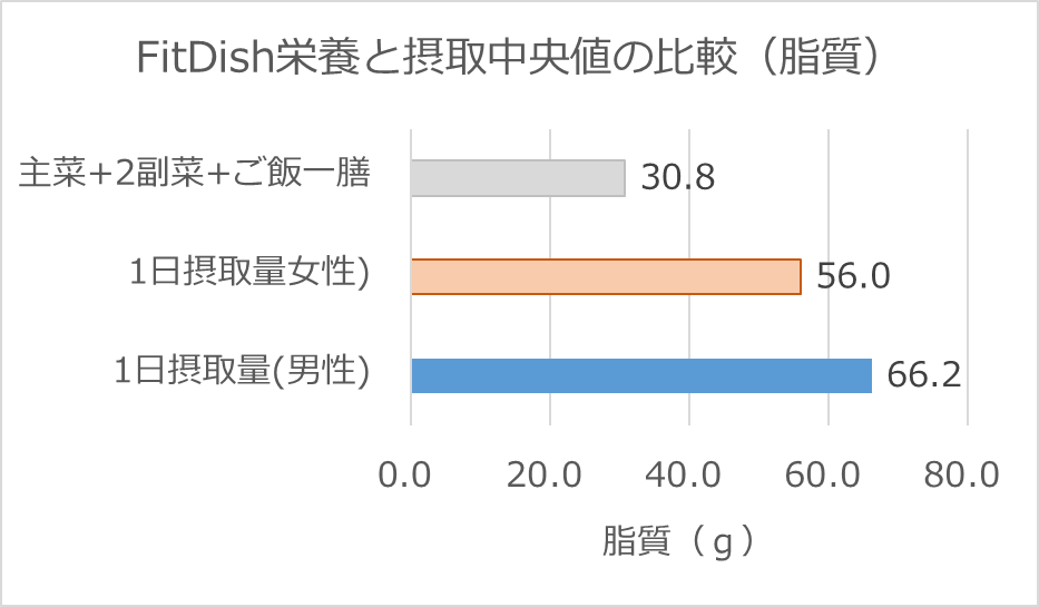 脂質においても、FitDishの主菜と2種類の副菜にご飯一膳を組み合わせた食事を1日に2回程度とると、男女共に日本人の1日摂取量(中央値)とだいたい同じになります。