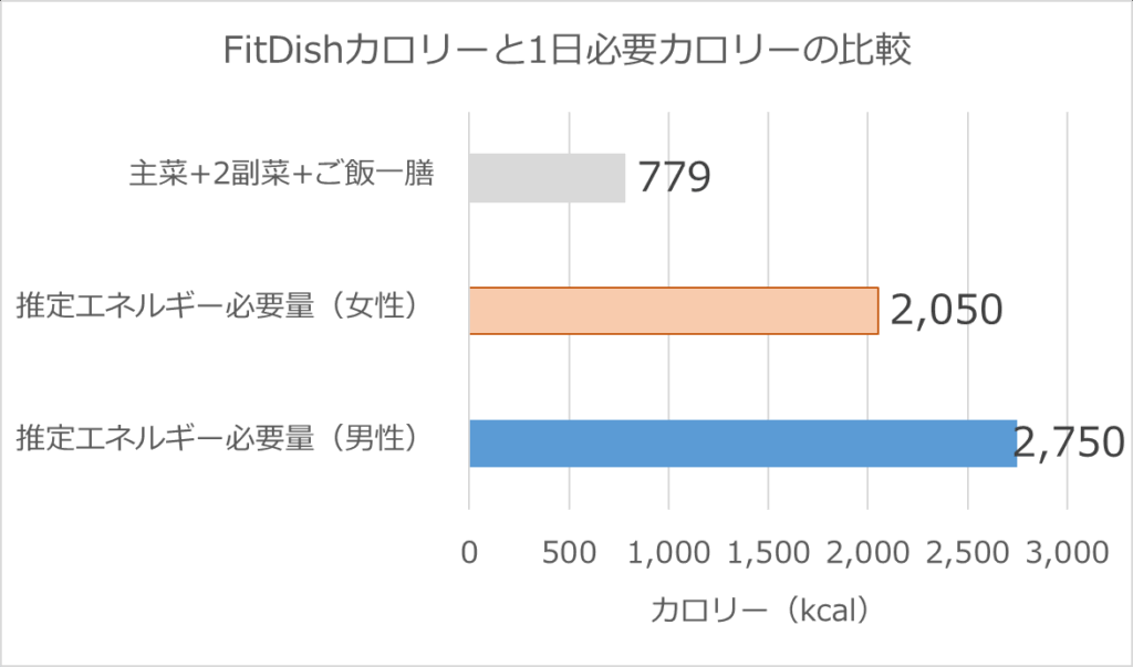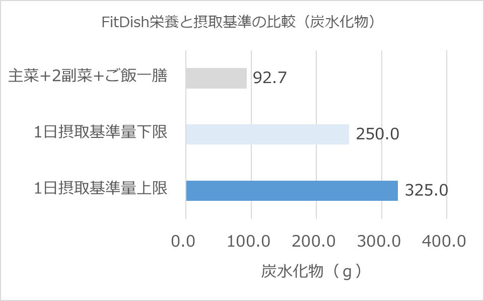 炭水化物においても、FitDishの主菜と2種類の副菜にご飯一膳を組み合わせた食事を1日に2回程度とると、男女共に日本人の1日摂取基準量とだいたい同じになります。