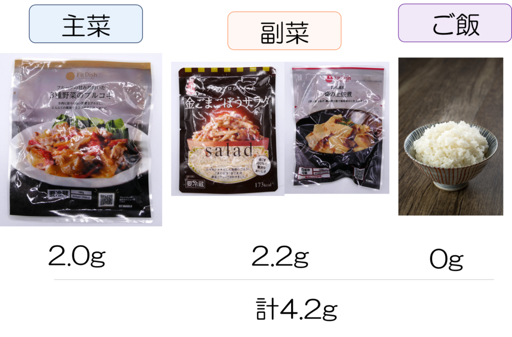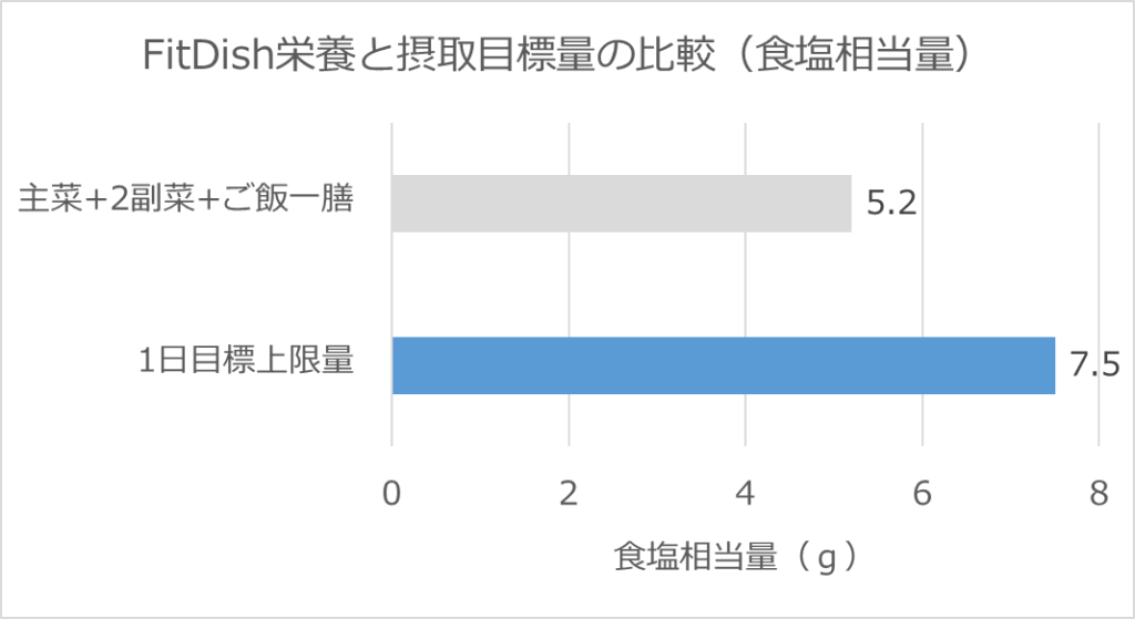 FitDishの主菜と2種類の副菜にご飯一膳を組み合わせた食事を1日に2回程度とると、10g程度です。日本人の1日あたりの食塩摂取量9.7g程度と同じくらいです。厚労省推奨値(7.5g)よりも少し多くなってしまいます。