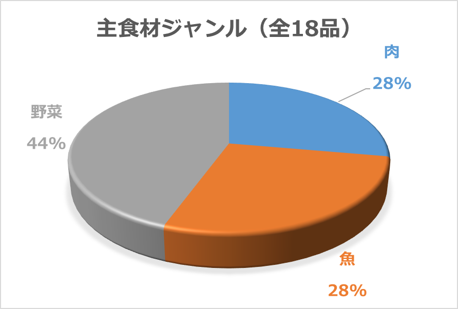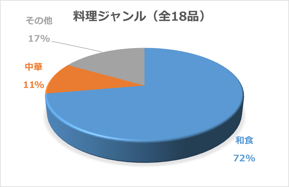 初回1ヵ月目の惣菜18品の中には、韓国料理(プルコギ)や中華料理(酢豚)も含まれていましたが、ほぼ和食の惣菜(72%)で統一されていました。
