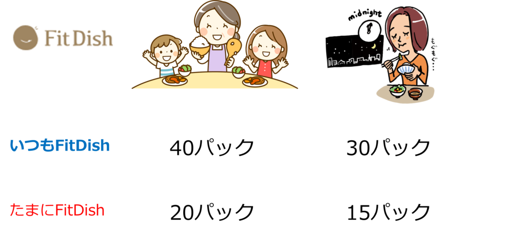 家族の人数(2人以上/単身)とFitDishのおかずを食べたい頻度(いつも/たまに)で、毎月の惣菜パック数を指定することをおすすめします。