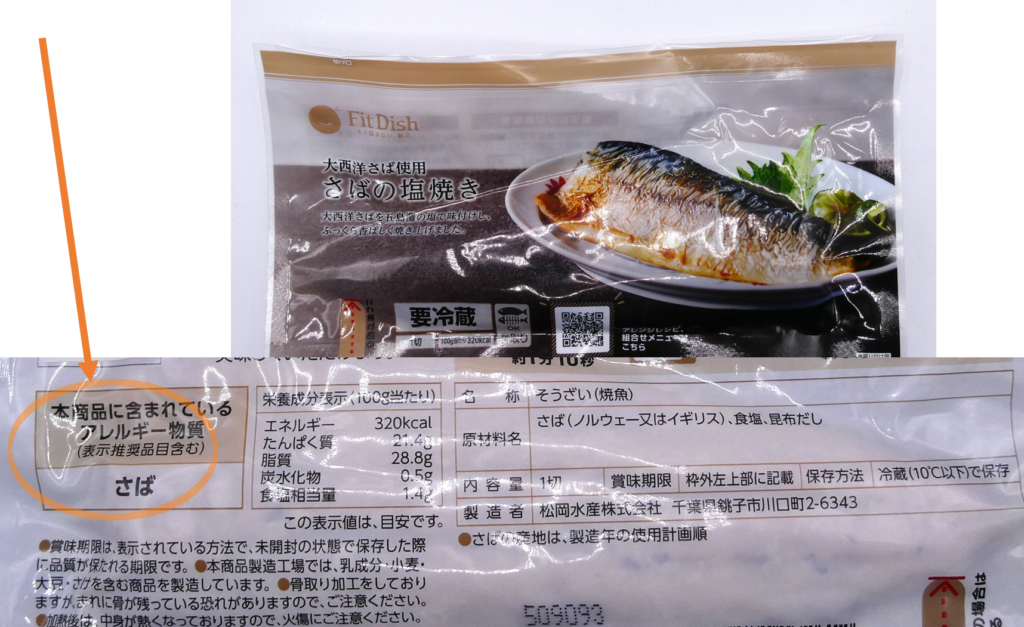 珍しくどちらも使われていないおかずは1品「ノルウェー産さば使用さばの塩焼き」。シンプルに鯖を塩焼きしたおかずなので、大豆・小麦共に未使用のようです。