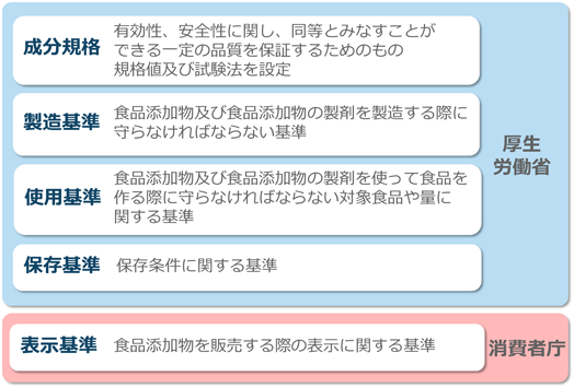 食品添加物は,食品衛生法で種類,品質,使用などが制限されており,食品添加物の規格・基準としてまとめられている