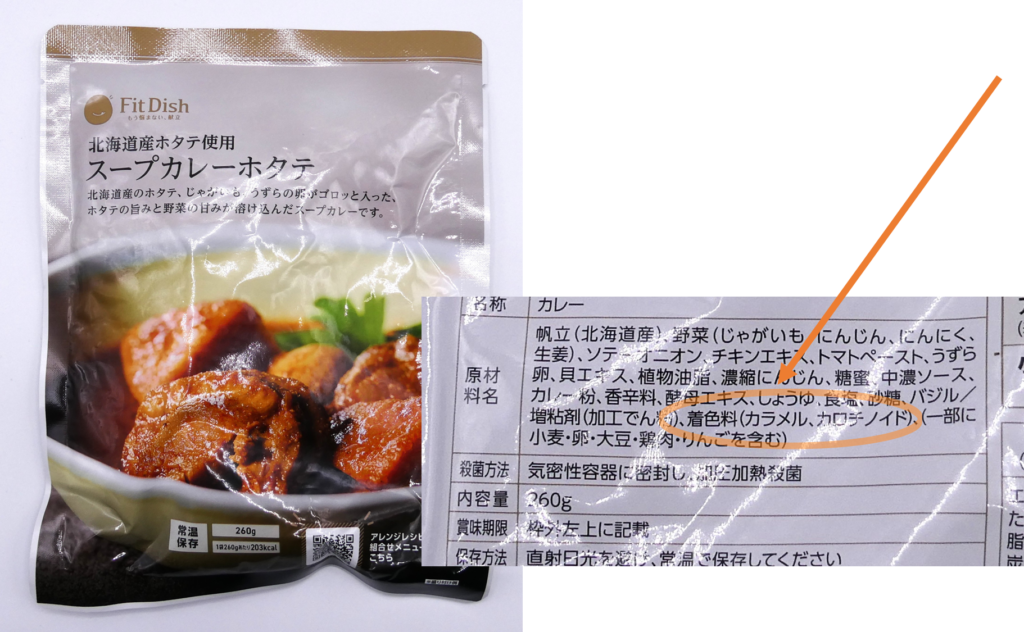 肉料理や野菜メインの惣菜と比較して海鮮料理(特にホタテを使ったおかず)には色素・着色料が比較的多く使われていました。
