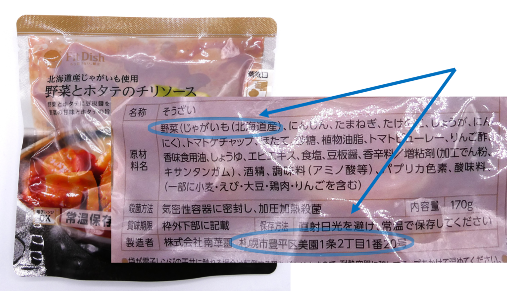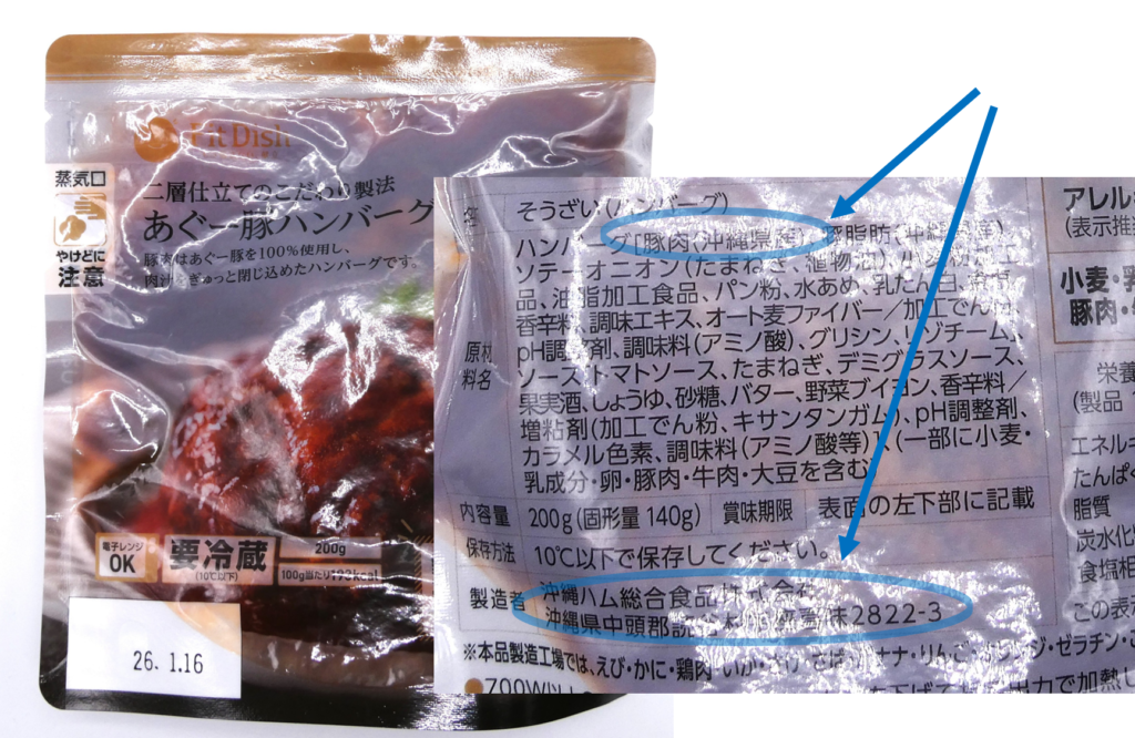 例えば、北海道産の野菜を使ったおかず「北海道産じゃがいも使用野菜とホタテのチリソース」は、北海道の食品工場で製造され、沖縄産の豚を用いた肉料理「二層仕立てのこだわり製法あぐー豚ハンバーグ」は、沖縄で製造されているといった感じです。