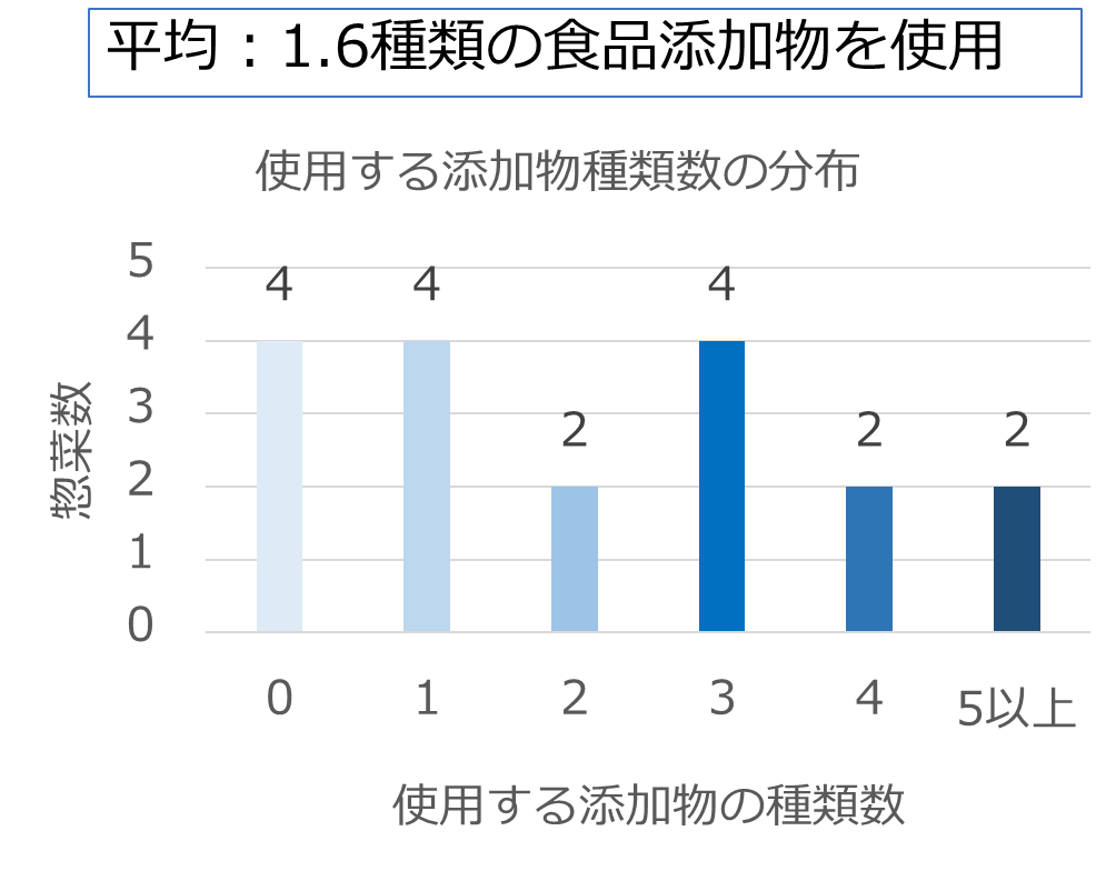 結果、全く食品添加物を使用していない惣菜は4品(約2割)もあり、使用食品添加物の種類の平均は1.6となりました。
