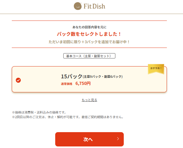 私は、単身でたま~にFitDishの惣菜を使って食事をしたかったので、15パックを選択!キャンペーン中で初回は18パックに増量されていました。次月からは15パックになります。